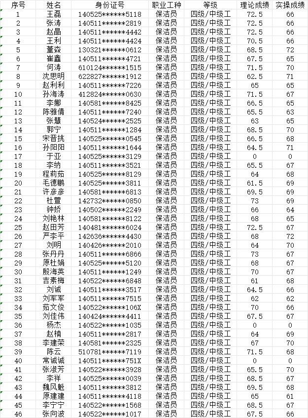 晉城市潔霸清潔服務(wù)股份有限公司職業(yè)技能等級(jí)認(rèn)定中心現(xiàn)將2024年1月21日認(rèn)定人員成績公示如下: