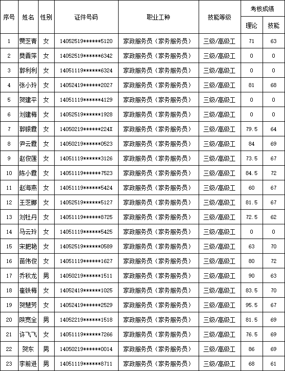 山西潔霸清潔服務(wù)集團(tuán)股份有限公司職業(yè)技能等級(jí)認(rèn)定中心現(xiàn)在將2025年8月30日認(rèn)定人員成績(jī)公示如下:
