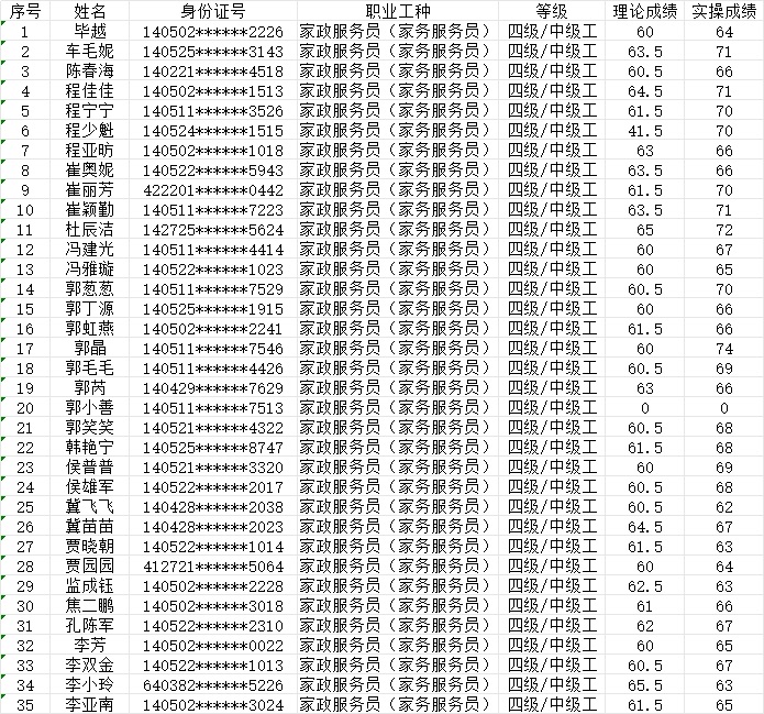 2024年1月14日第1批家政服務員中級認定人員成績公示
