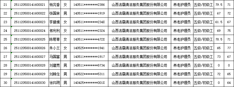 山西潔霸清潔服務(wù)集團(tuán)股份有限公司職業(yè)技能等級(jí)認(rèn)定中心現(xiàn)將2025年11月22日認(rèn)定人員成績(jī)公示如下: